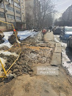 Вместо тротуара месиво из грязи, справа от тротуара траншея с торчащими ржавыми трубами, слева сплошной ряд припаркованных машин.Просто пешеходам сложно пройти ,а с колясками ,вообще,не реально.